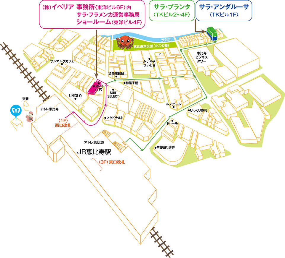フラメンコショーとお食事が楽しめるスペインレストラン「サラ・アンダルーサ」、都内屈指の広さを誇る総合レンタルスタジオ「サラ・プランタ」へも是非お立ち寄りください。